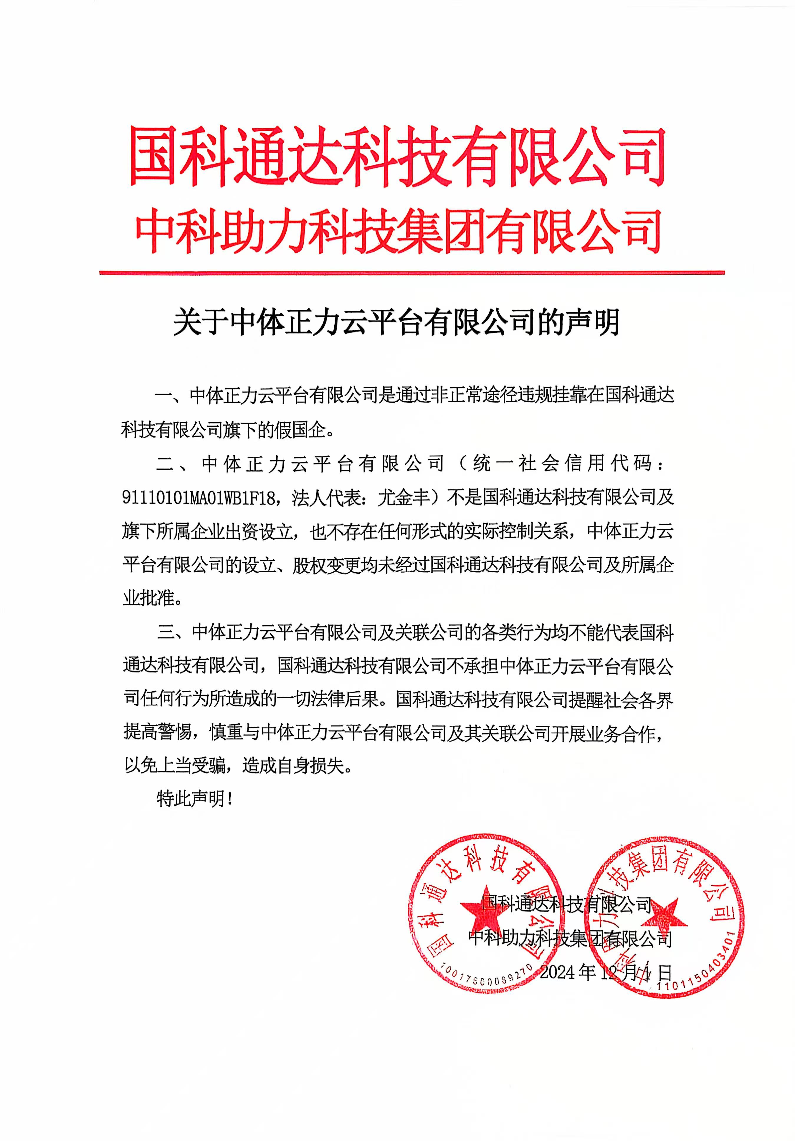 關(guān)于中體正力云平臺(tái)有限公司的聲明 一、中體正力云平臺(tái)有限公司是通過非正常途徑違規(guī)掛靠在國科通達(dá)科技有限公司旗下的假國企。二、中體正力云平臺(tái)有限公司(統(tǒng)一社會(huì)信用代